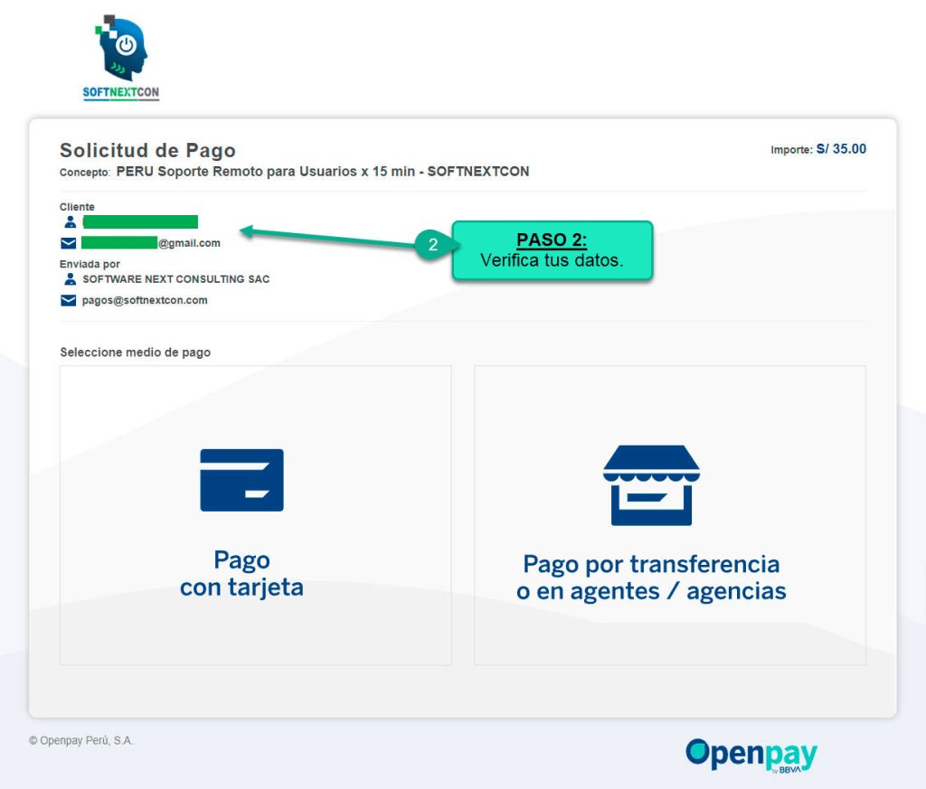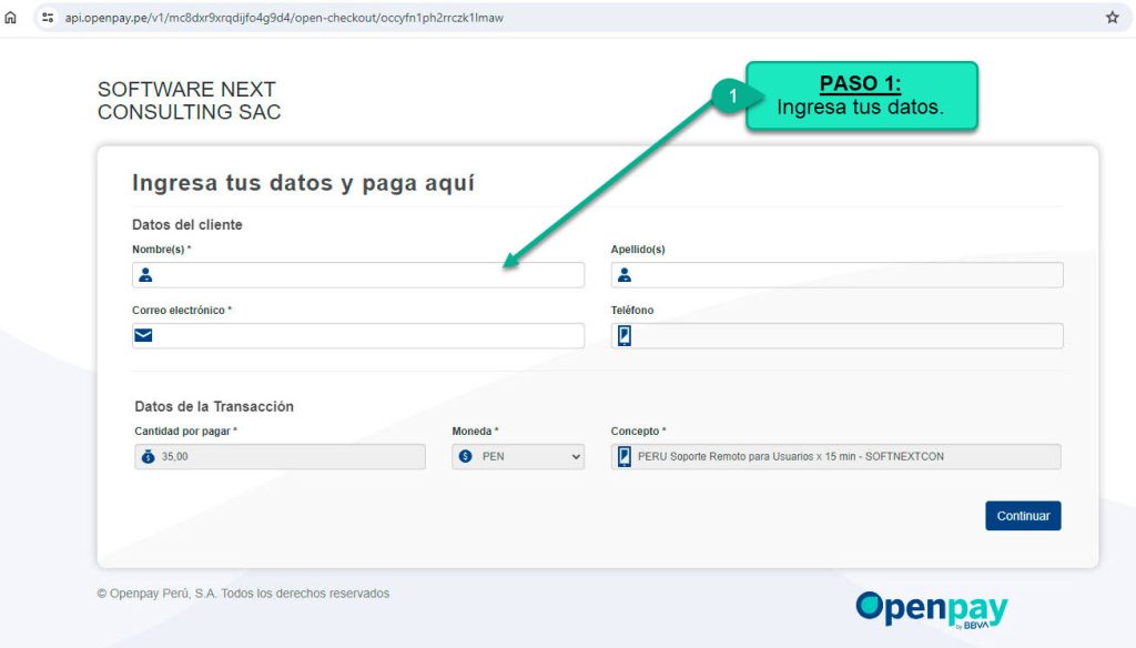 Ingresa tus datos desde el link de PERU Soporte Remoto «Pago Seguro con OpenPay BBVA SOFTNEXTCON» aquí y completa tus datos:
